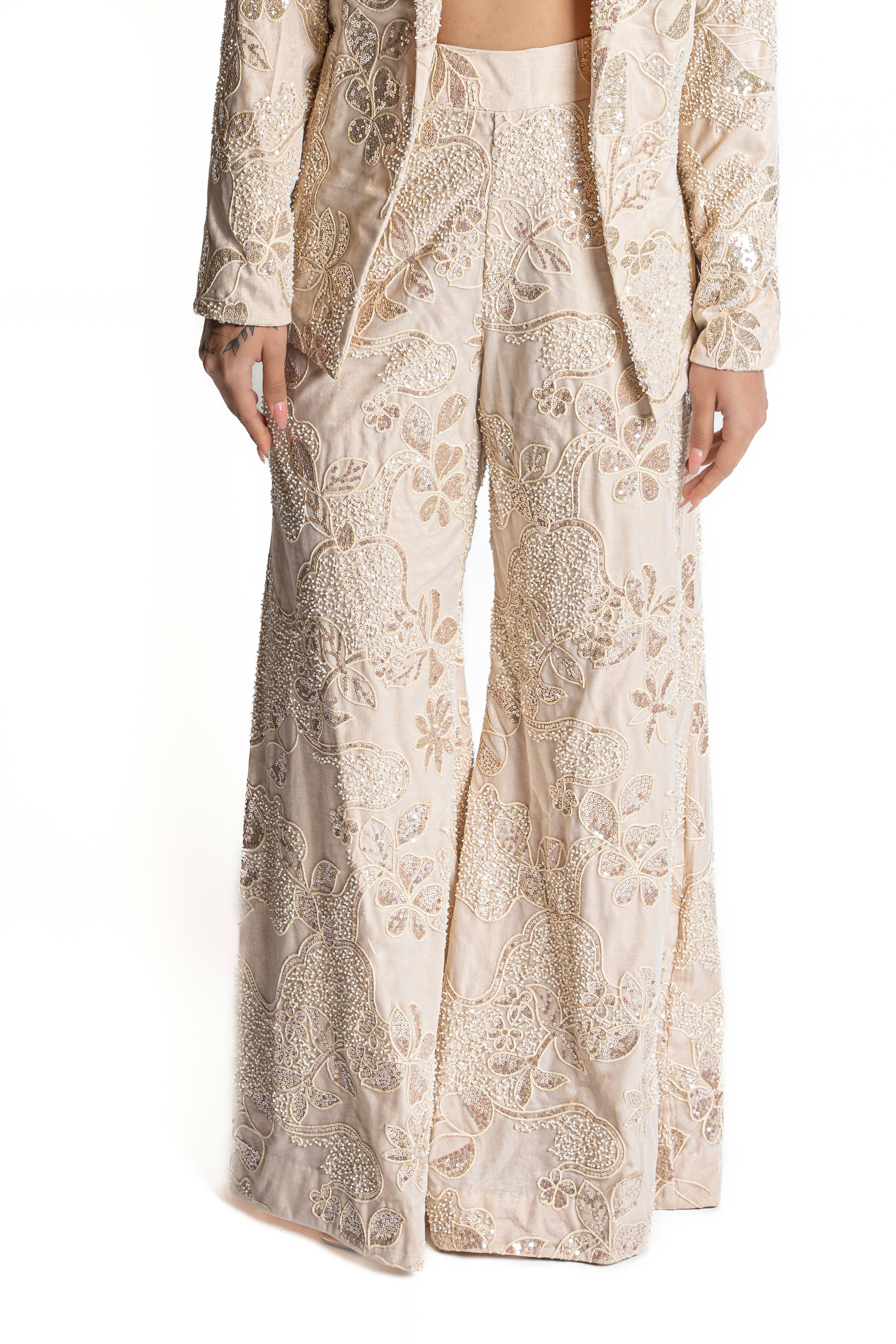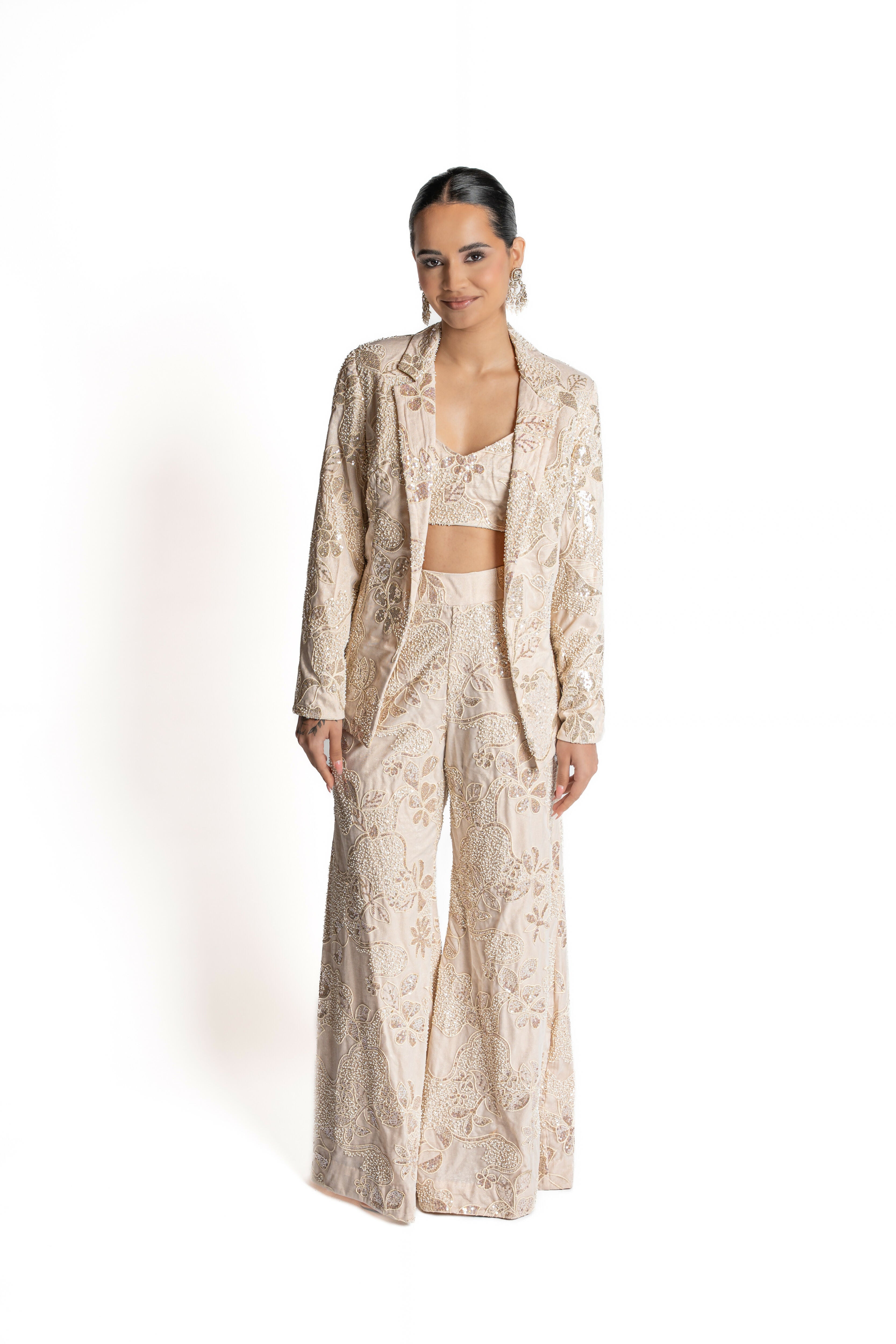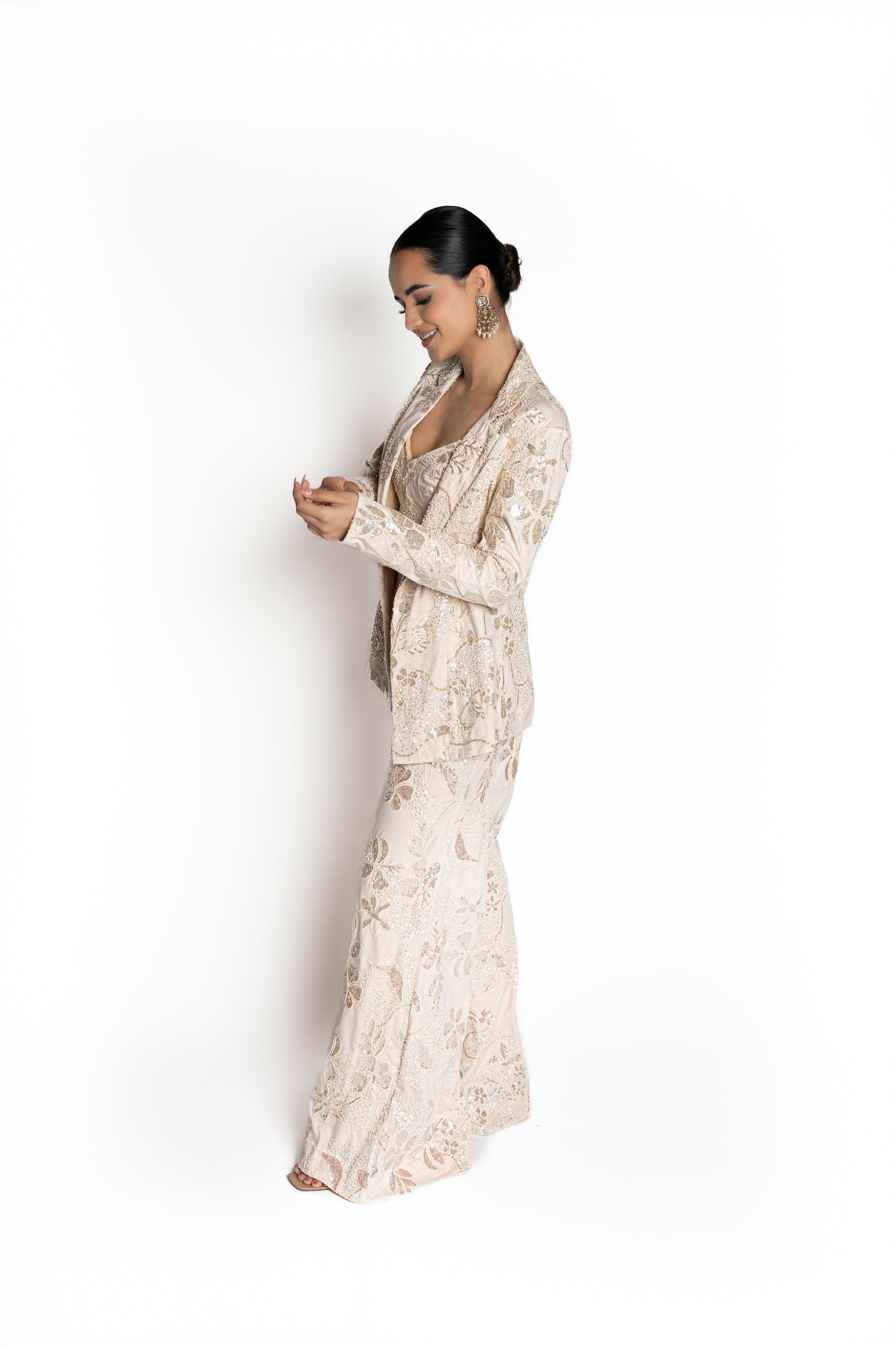 Whether you're a bride redefining reception wear or a guest making a statement, this look delivers understated opulence. Crafted from premium dupioni fabric in a soft crème and pearl palette, Amaya is elevated with hand embroidery and sequin detailing that adds just the right amount of shimmer. For the woman who leads with elegance and leaves a lasting impression, Amaya is your power suit, reimagined.