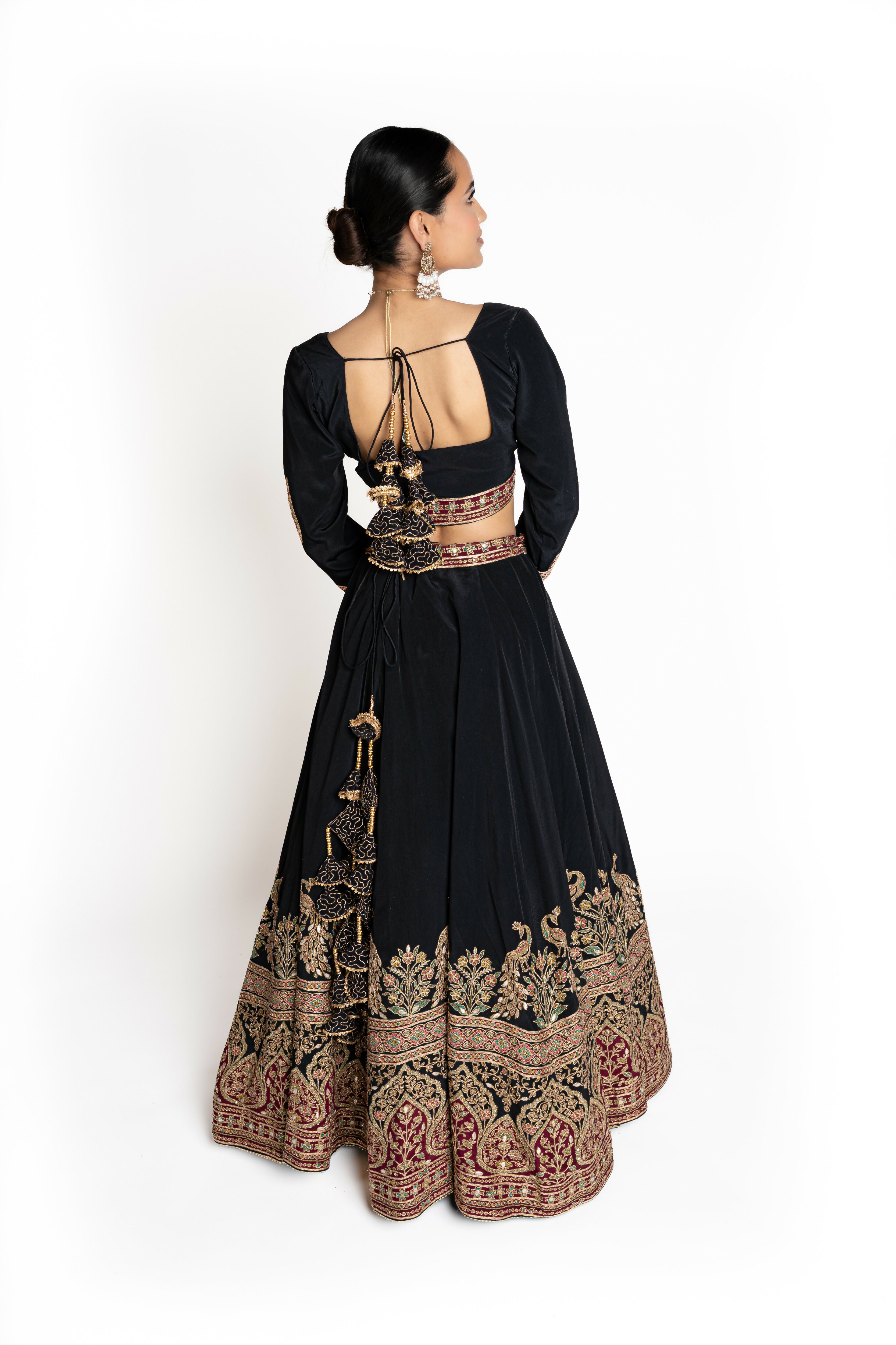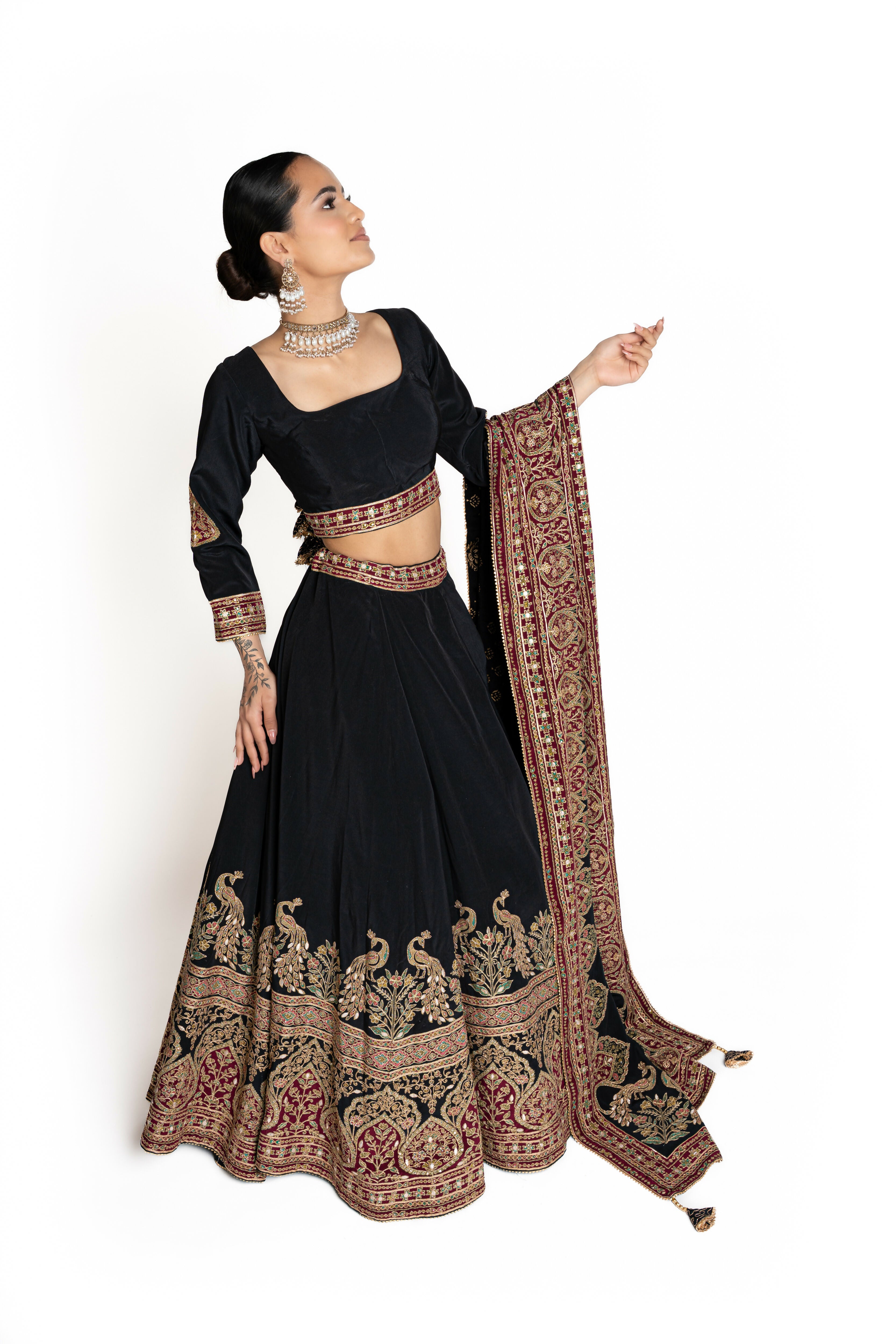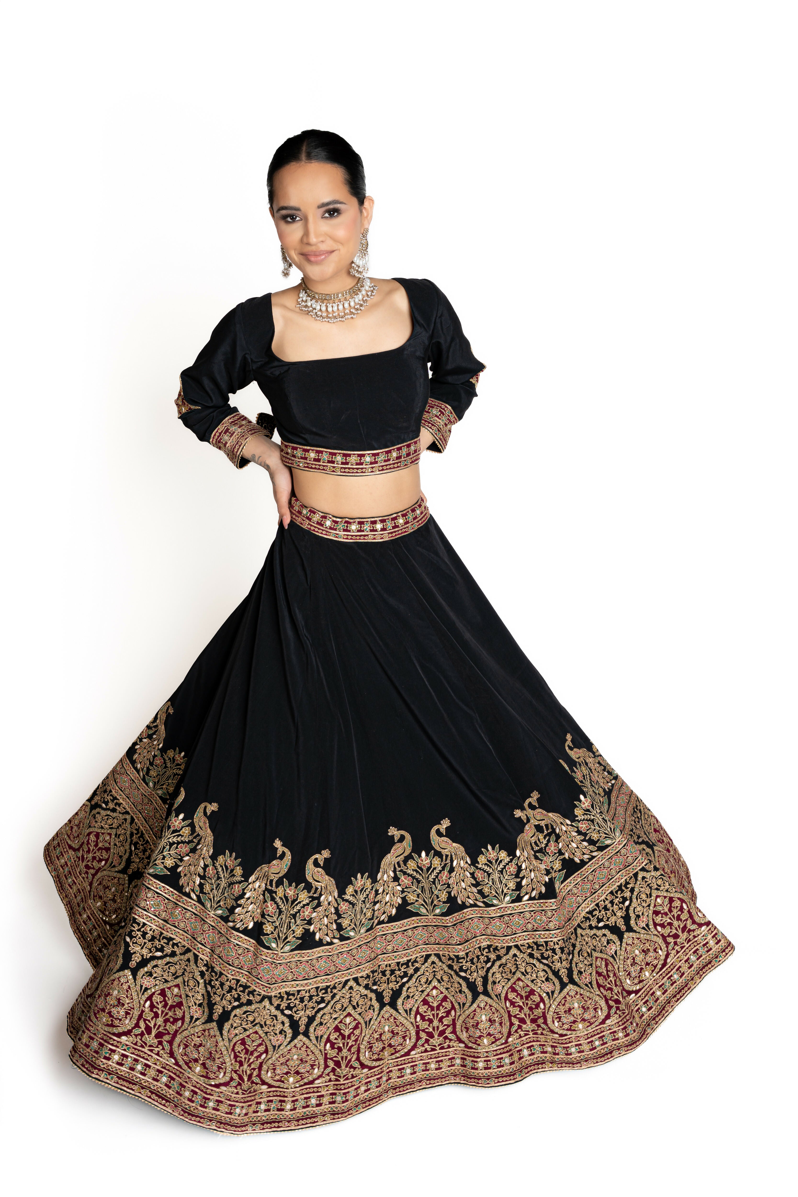 Material: Premium Crepe Color Palette: Black, Gold & Red Type: Lengha Size: Custom sizing, Made-to-order Delivery: 6 weeks
