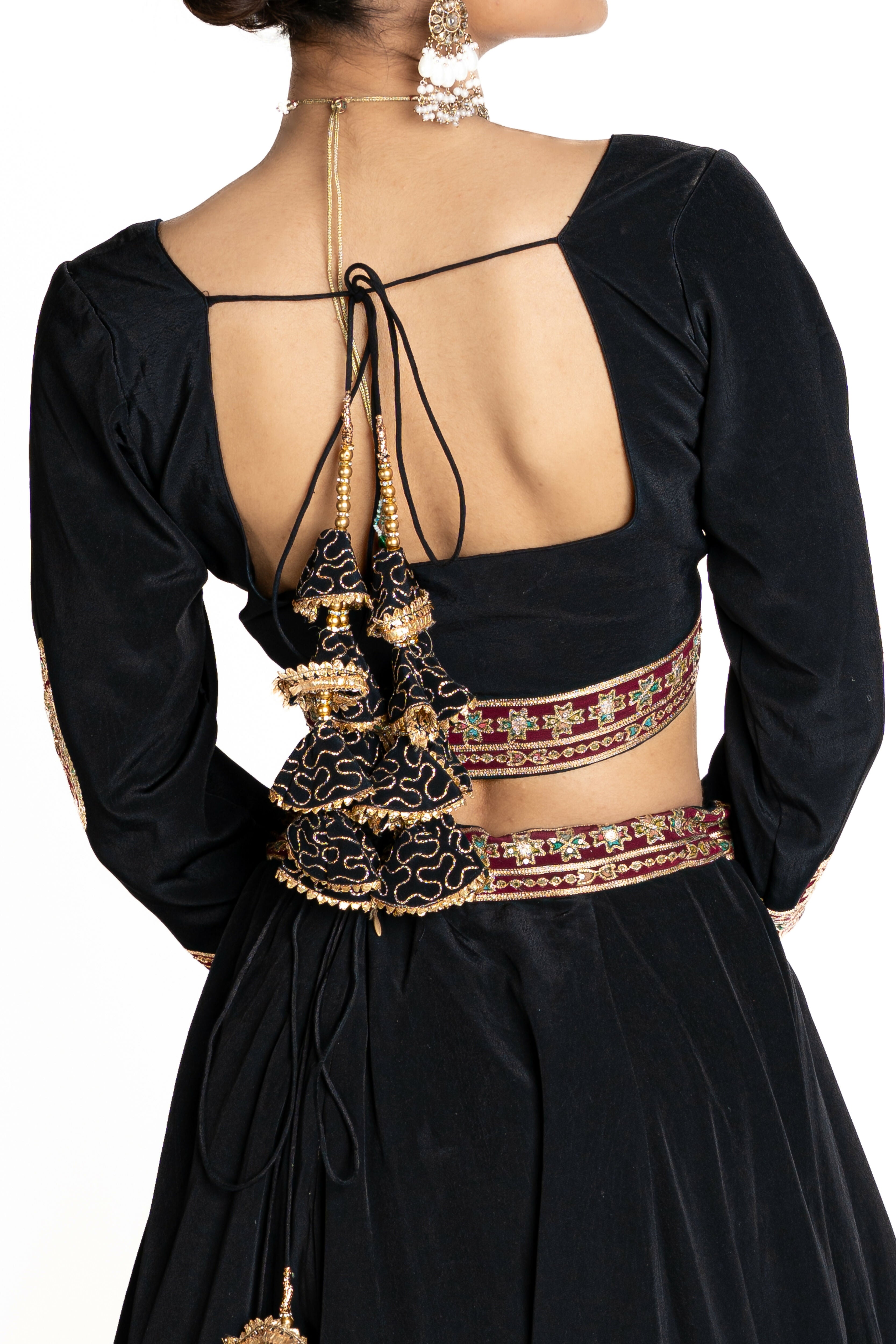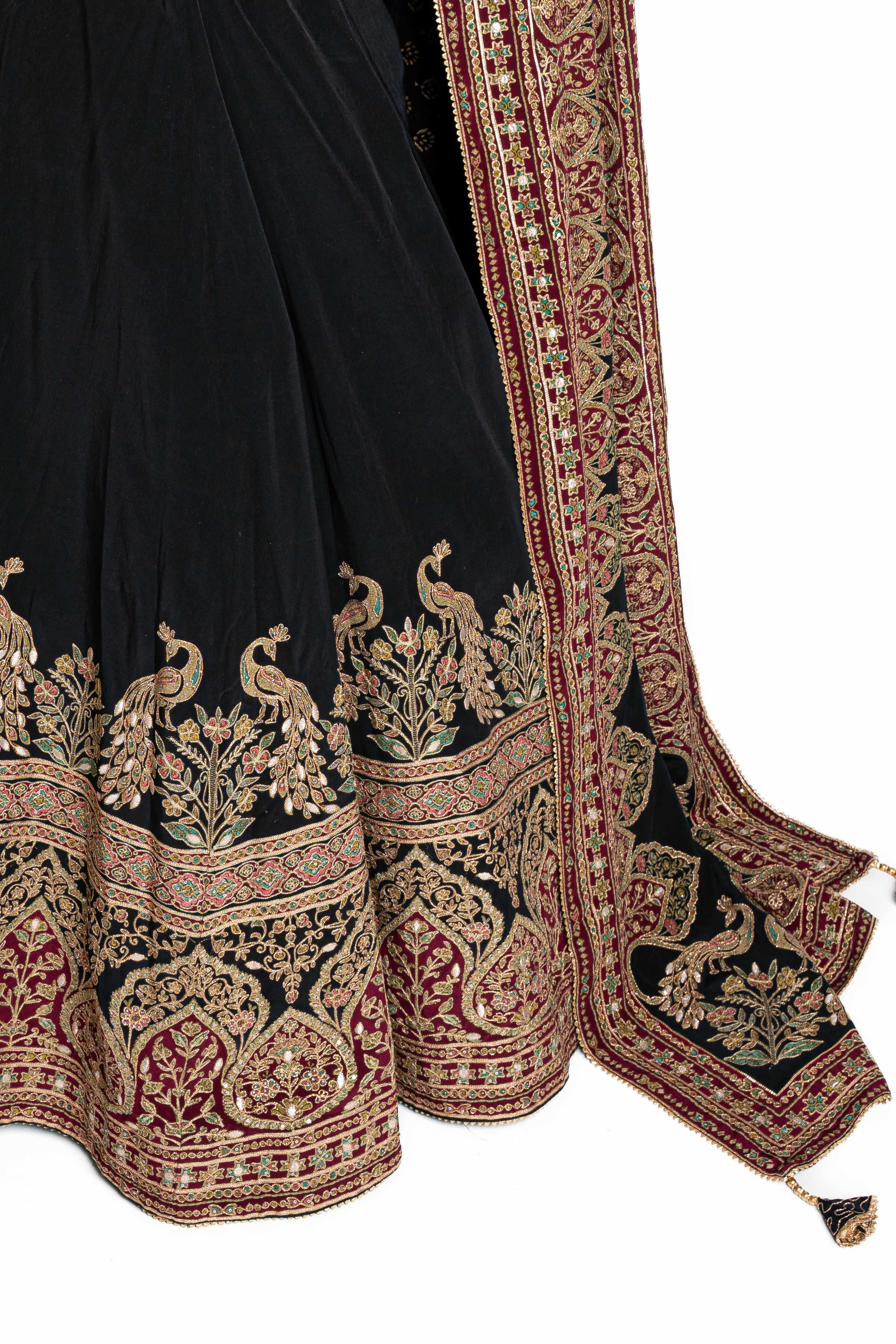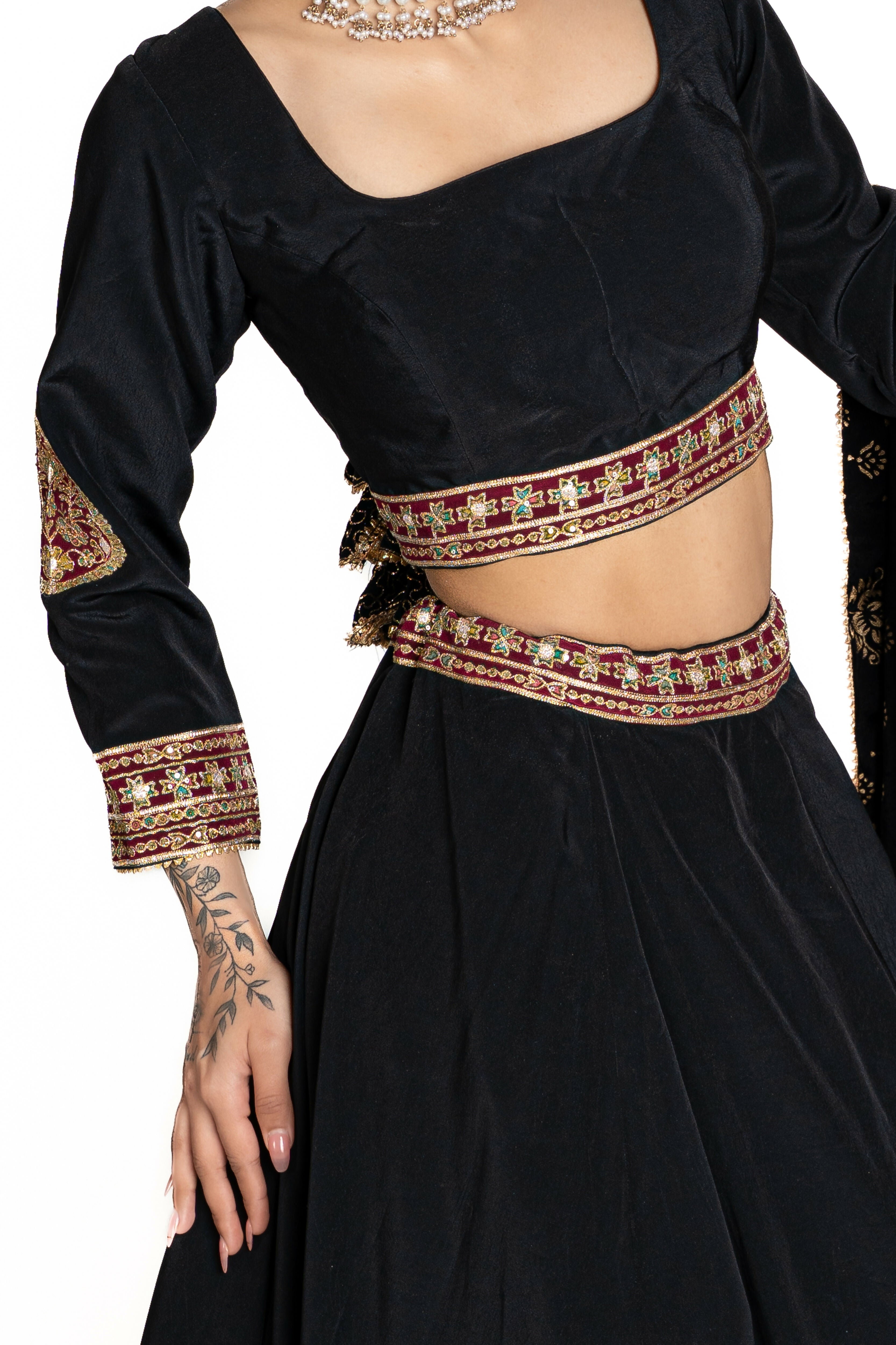 Material: Premium Crepe Color Palette: Black, Gold & Red Type: Lengha Size: Custom sizing, Made-to-order Delivery: 6 weeks
