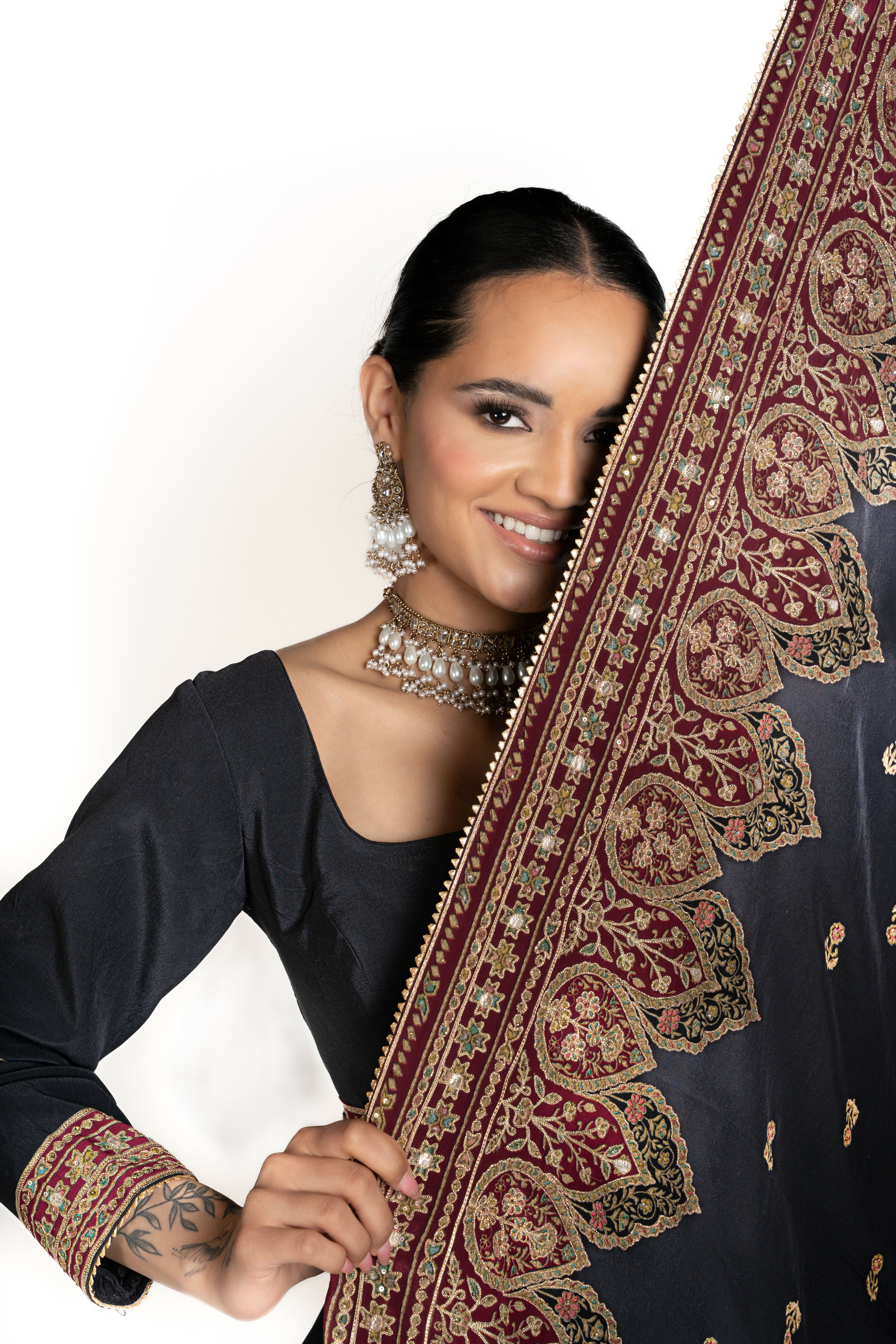 Make an entrance in Divya! A striking lengha made for unforgettable nights. Crafted from luxe crepe fabric, this showstopper features a commanding black base, illuminated by gold accents and pops of rich red. The silhouette is structured yet fluid, designed to move with you, from grand celebrations to after-party glamour.