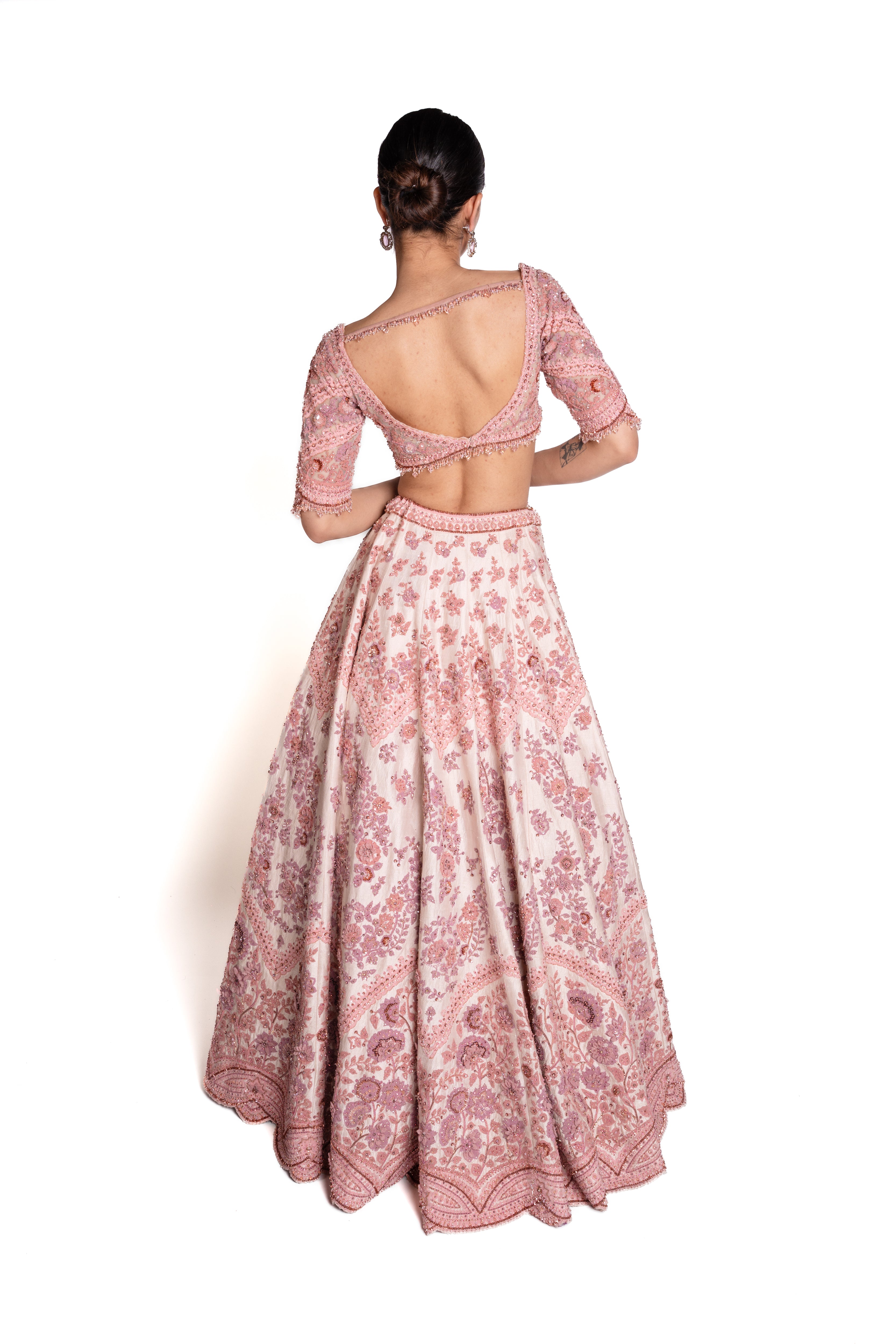 Designed for the bride who embraces both softness and strength, Manjari is a vision of refined elegance. This bridal lengha features a delicate blend of crème and blush pink, brought to life through intricate resham French knot embroidery on sumptuous raw silk. Every thread tells a story of craftsmanship and tradition, woven for your most meaningful moment.