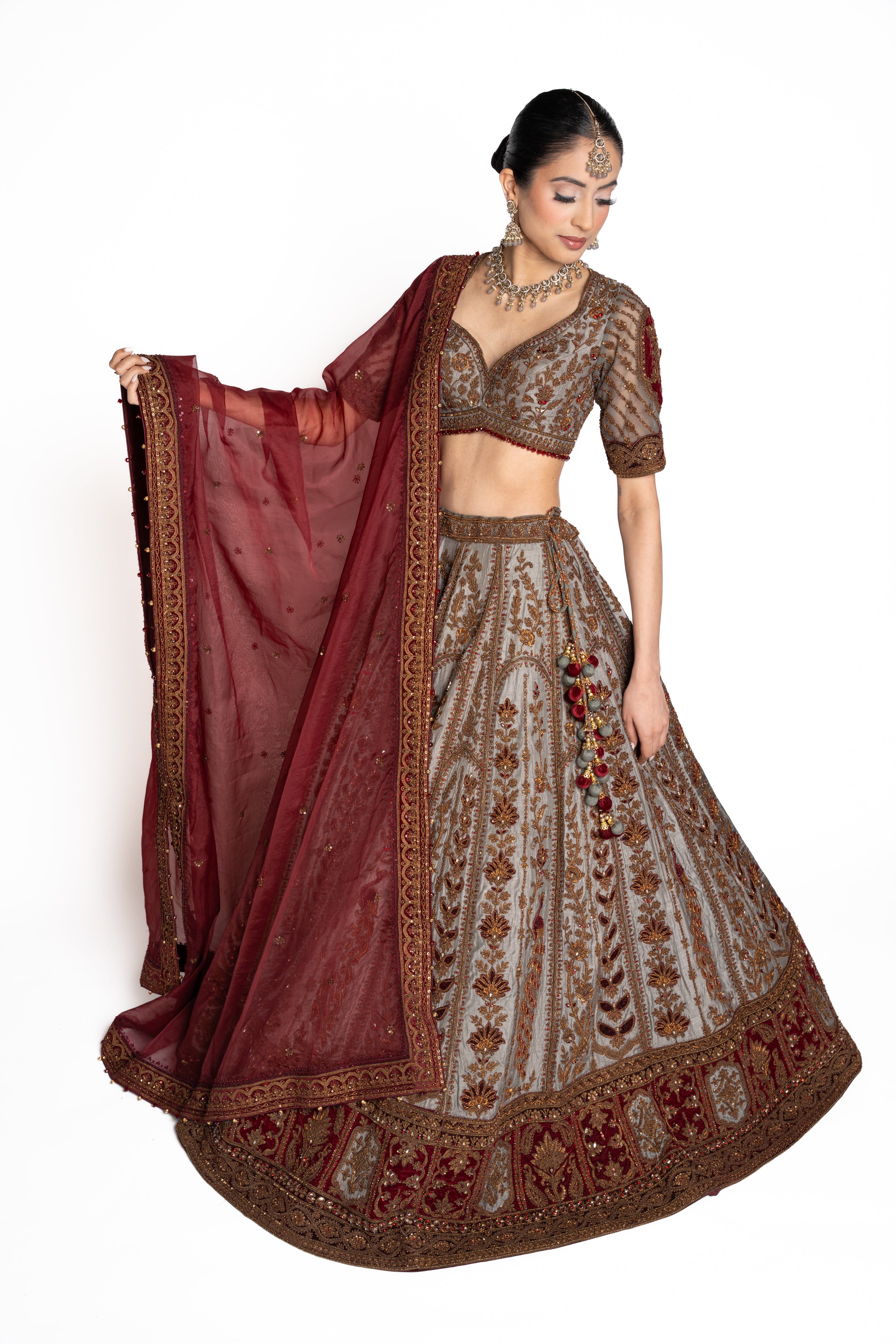Neelam – Grey-Blue & Maroon Velvet Bridal Lengha