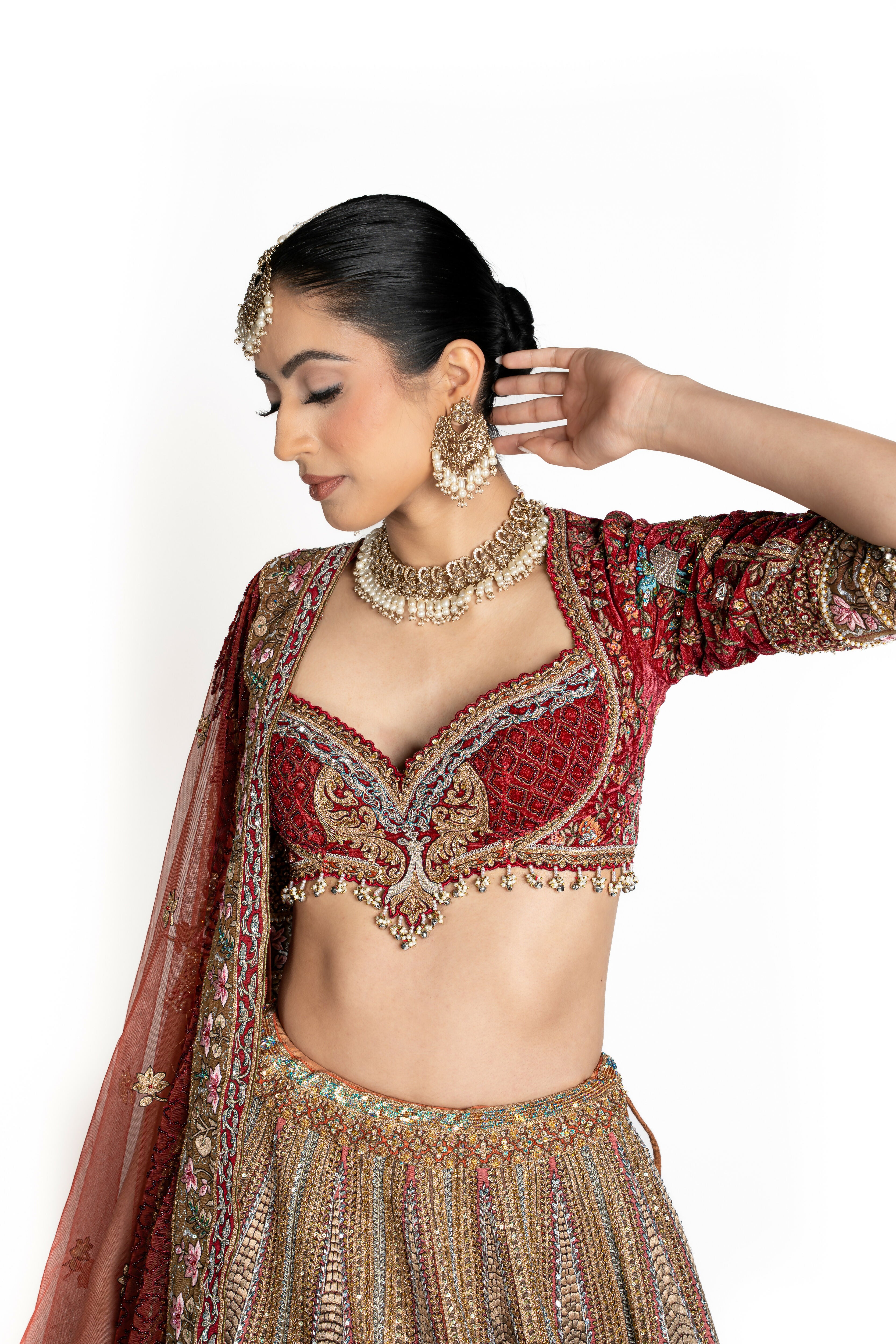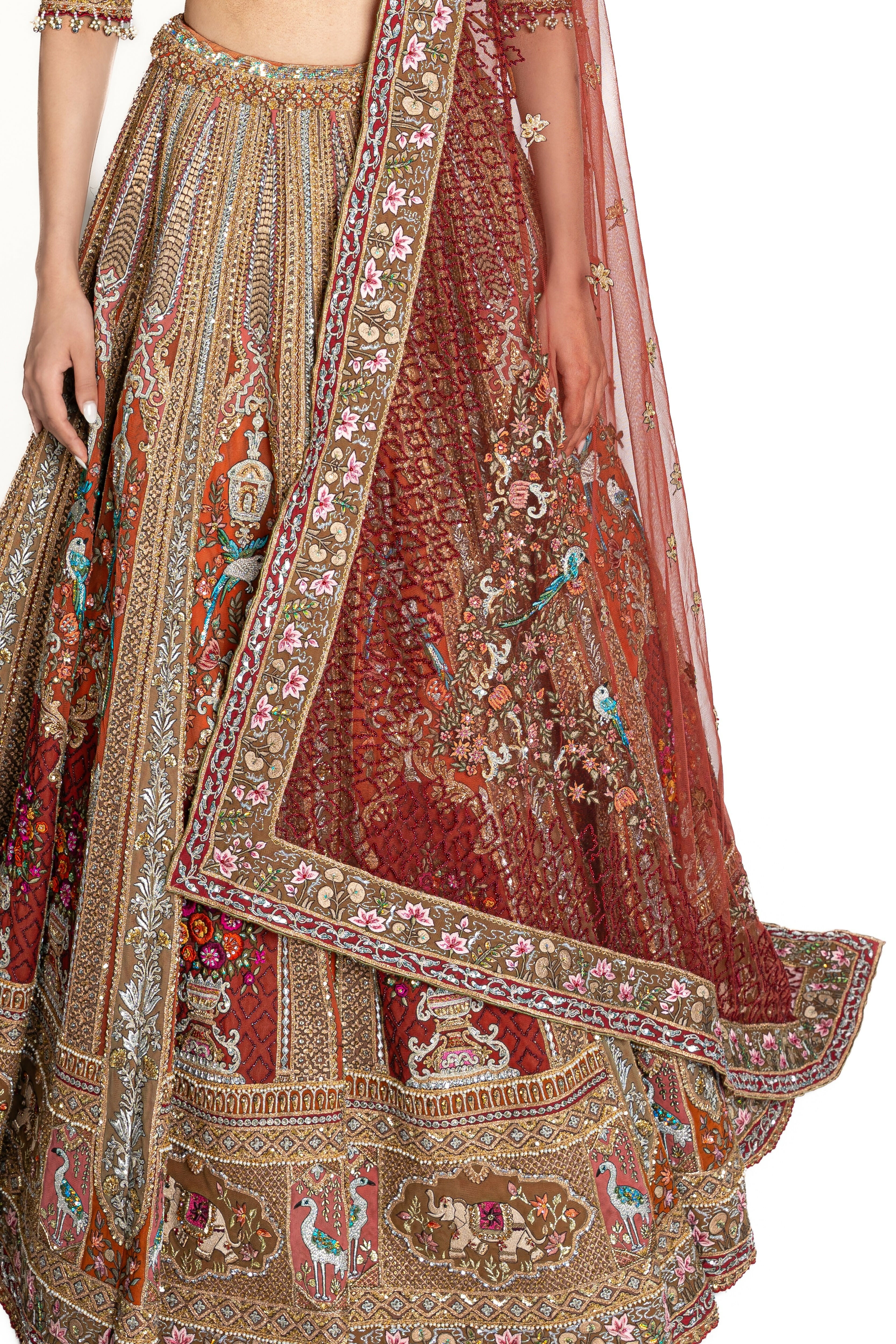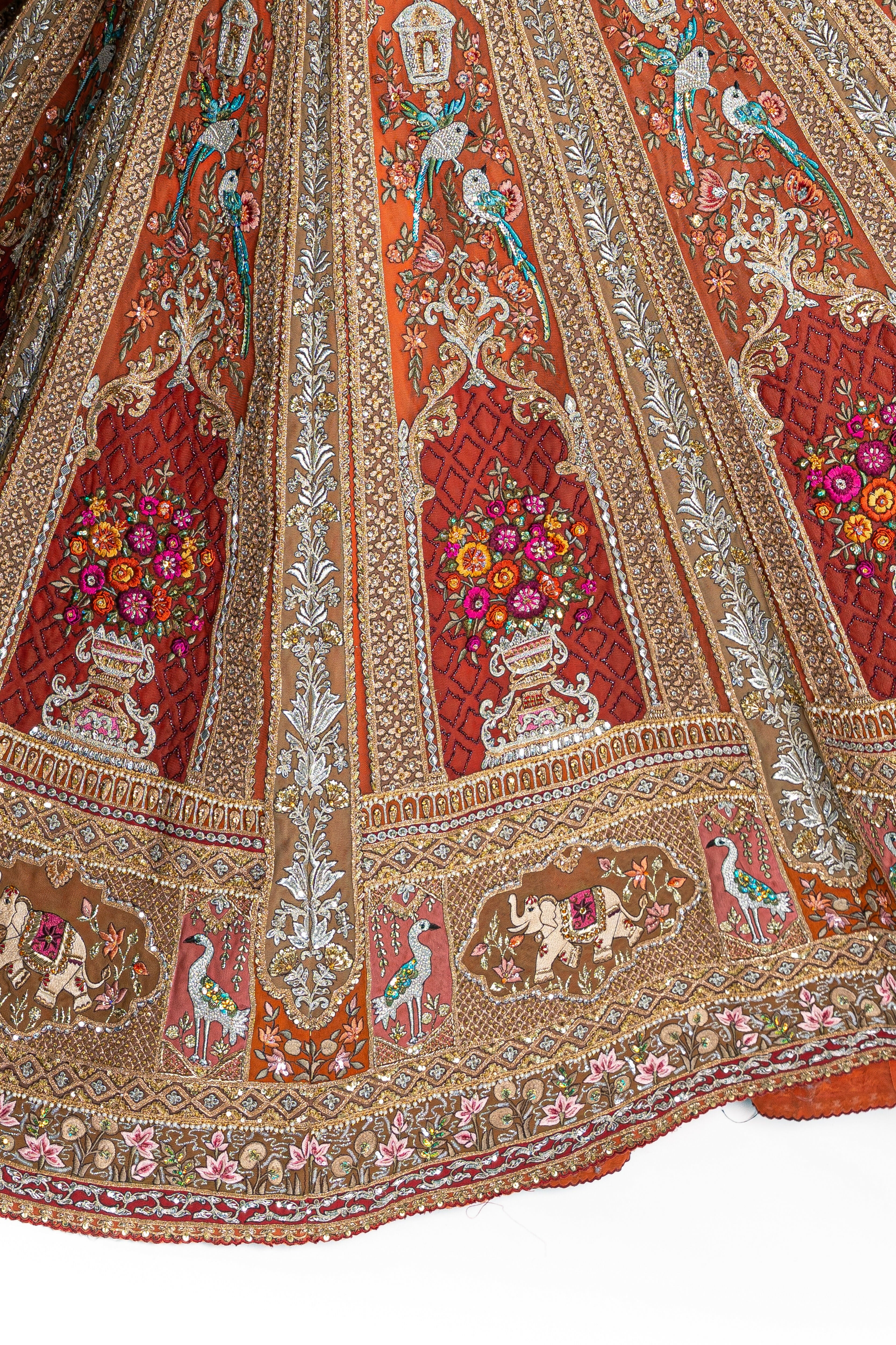 Rendered in rich tones of burnt orange and deep maroon, this couture piece is crafted in net fabric and lavishly adorned with appliqué and hand-done zardozi embroidery.