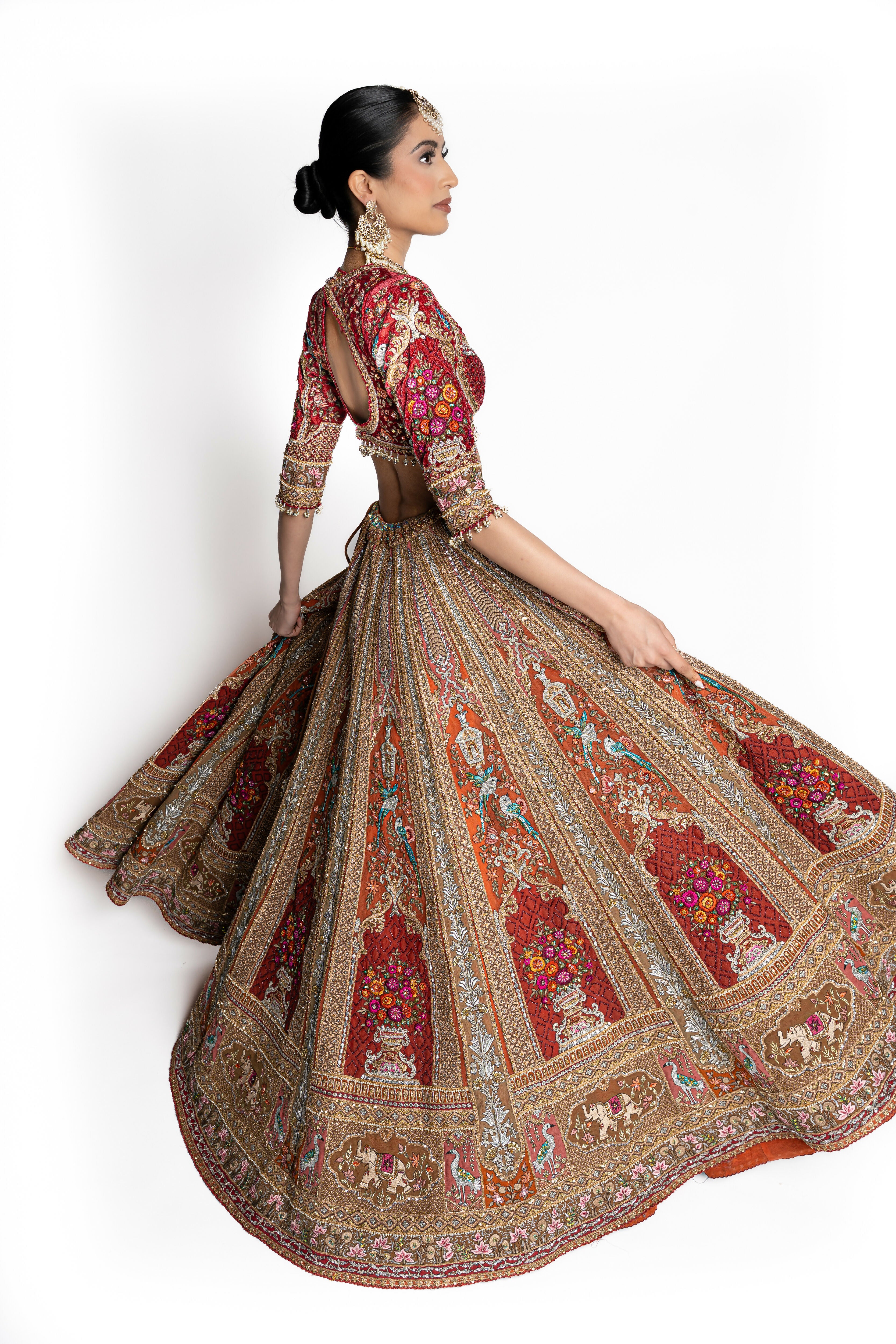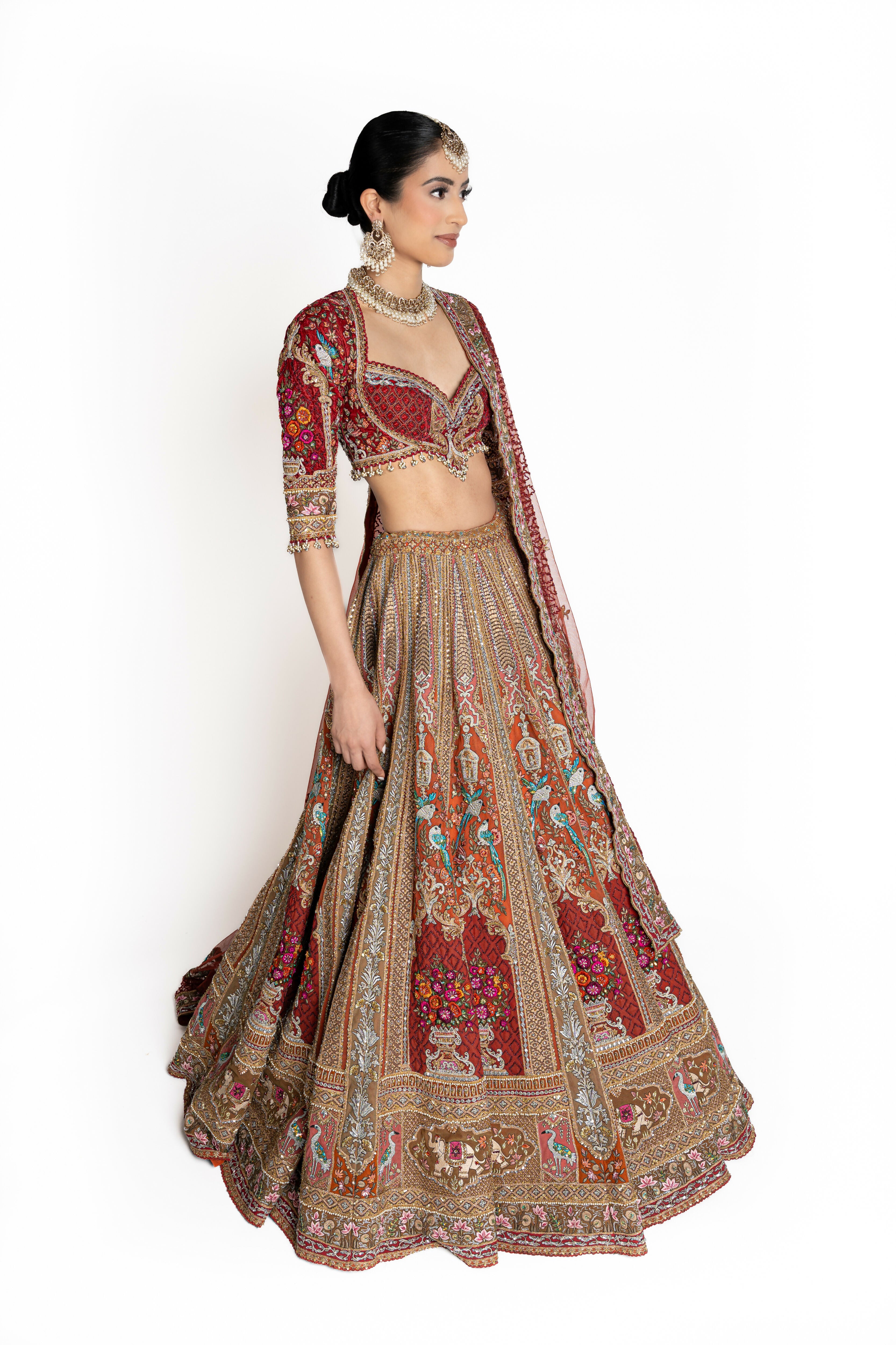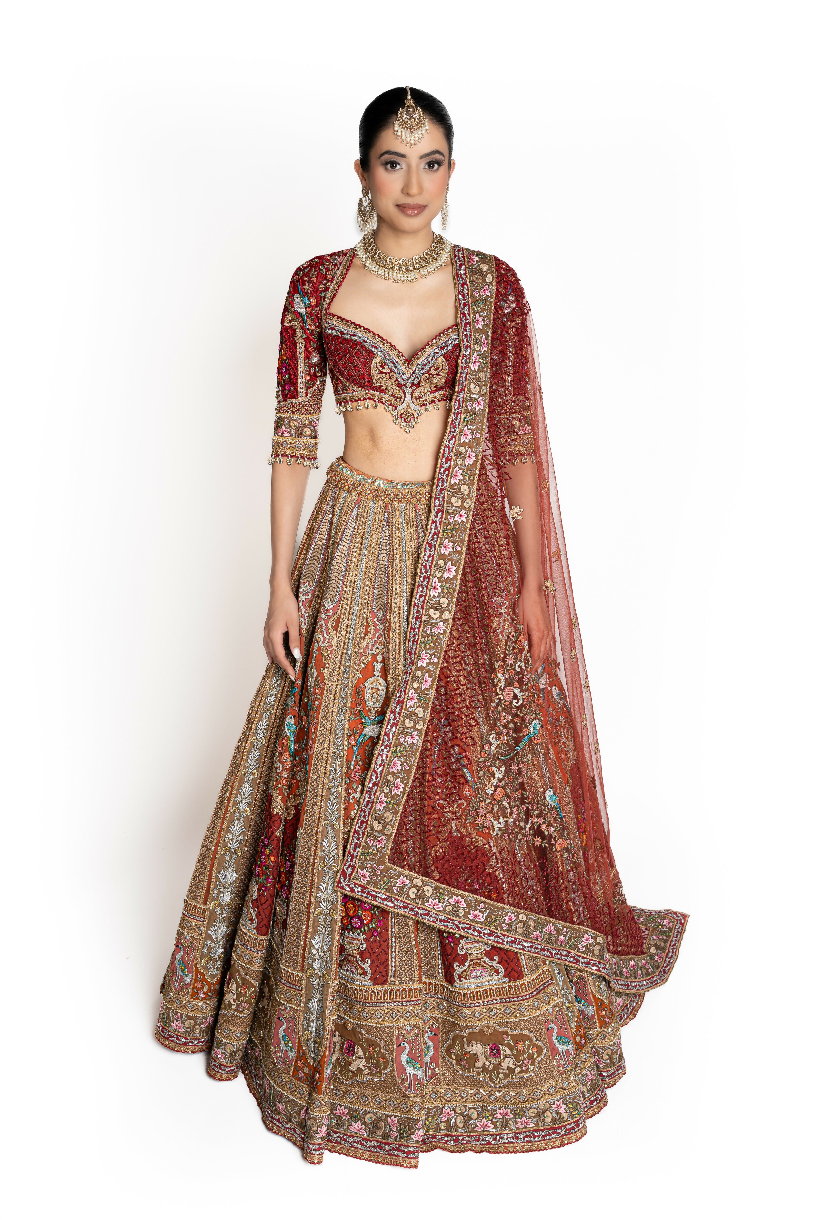 Rendered in rich tones of burnt orange and deep maroon, this couture piece is crafted in net fabric and lavishly adorned with appliqué and hand-done zardozi embroidery.
