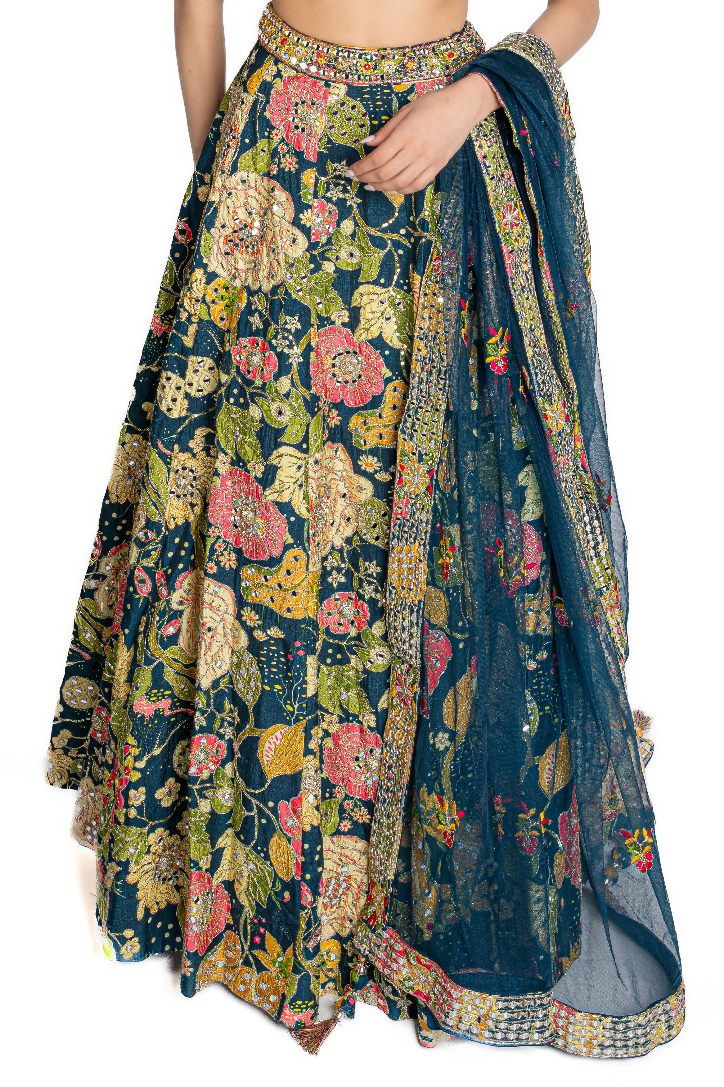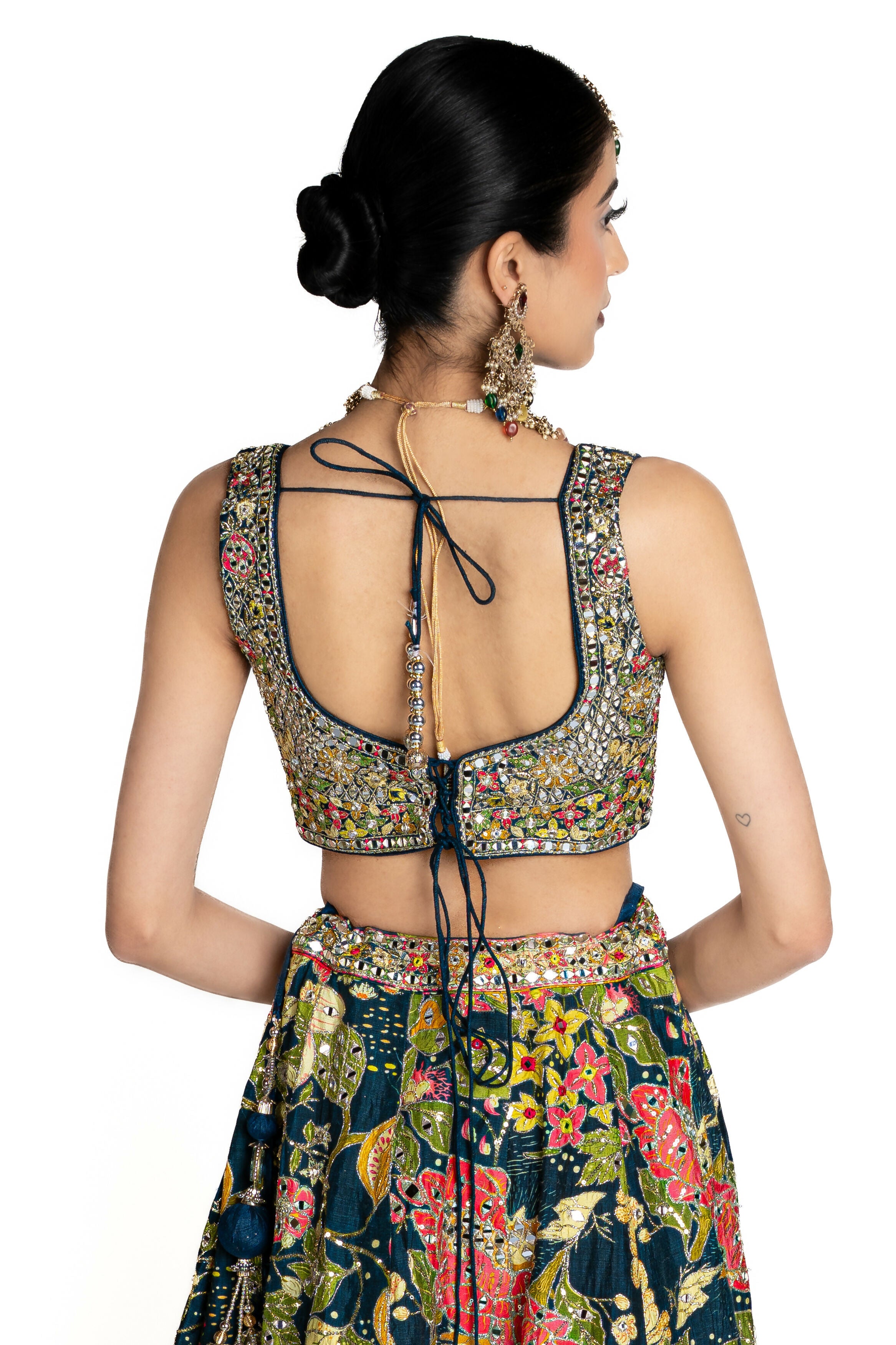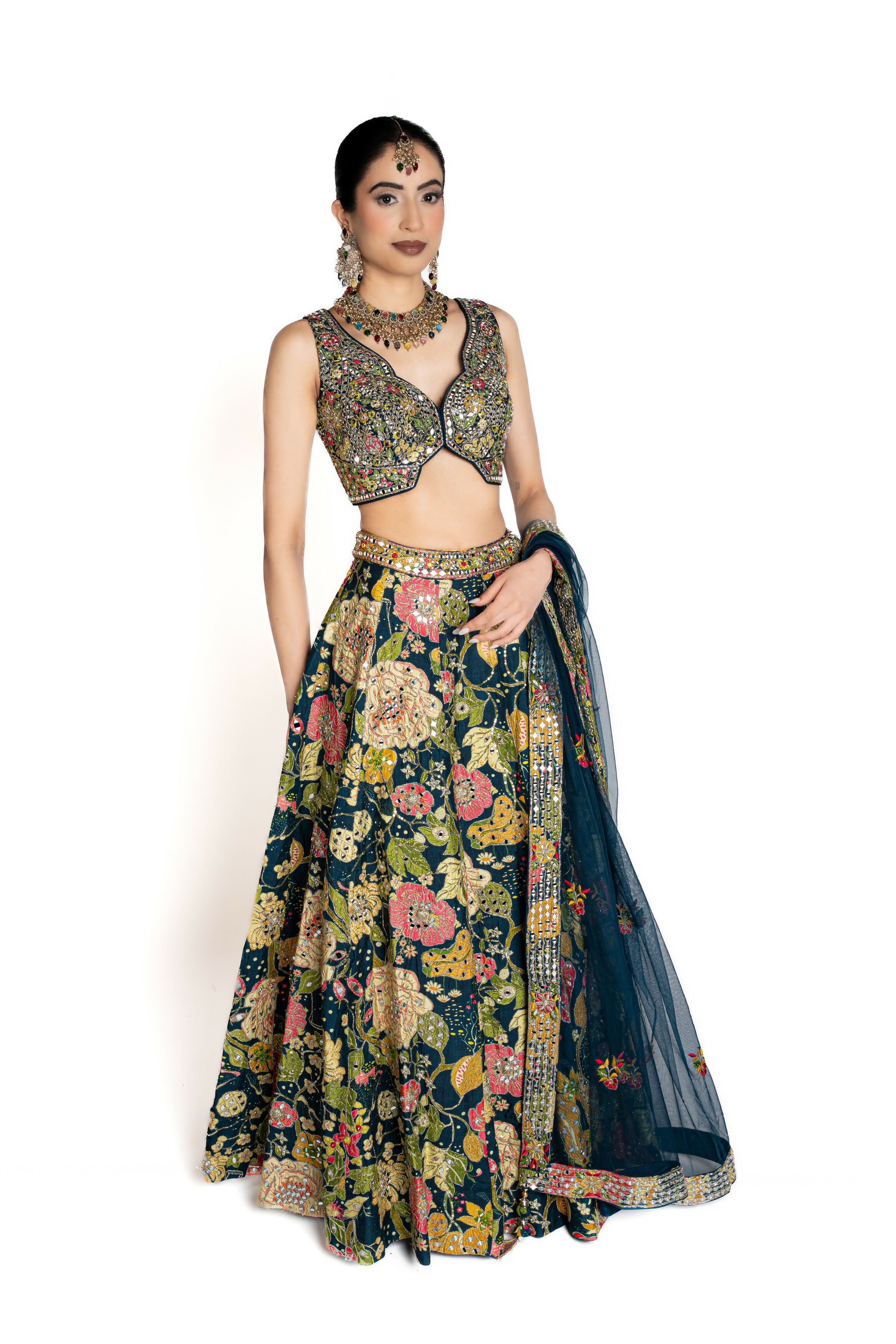 Chic, modern, and effortlessly elegant, Varnika is your go-to for any celebration that calls for standout style. Made from luxurious dupioni silk fabric in deep navy blue, this lengha is adorned with digitally printed florals and finished with delicate hand embroidery and mirror work for just the right touch of shimmer. It's bold yet graceful, making it perfect for upscale parties or evening functions.