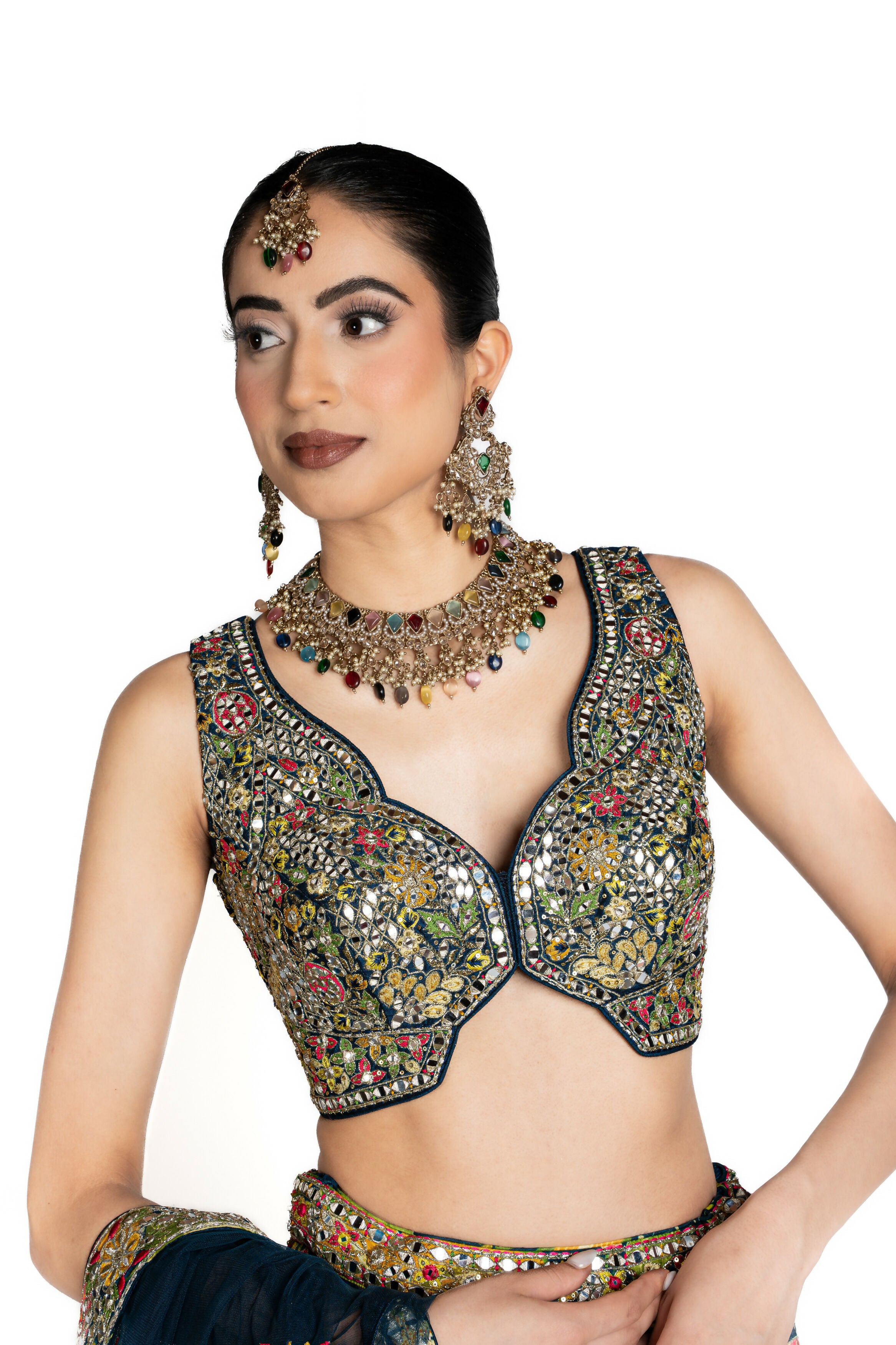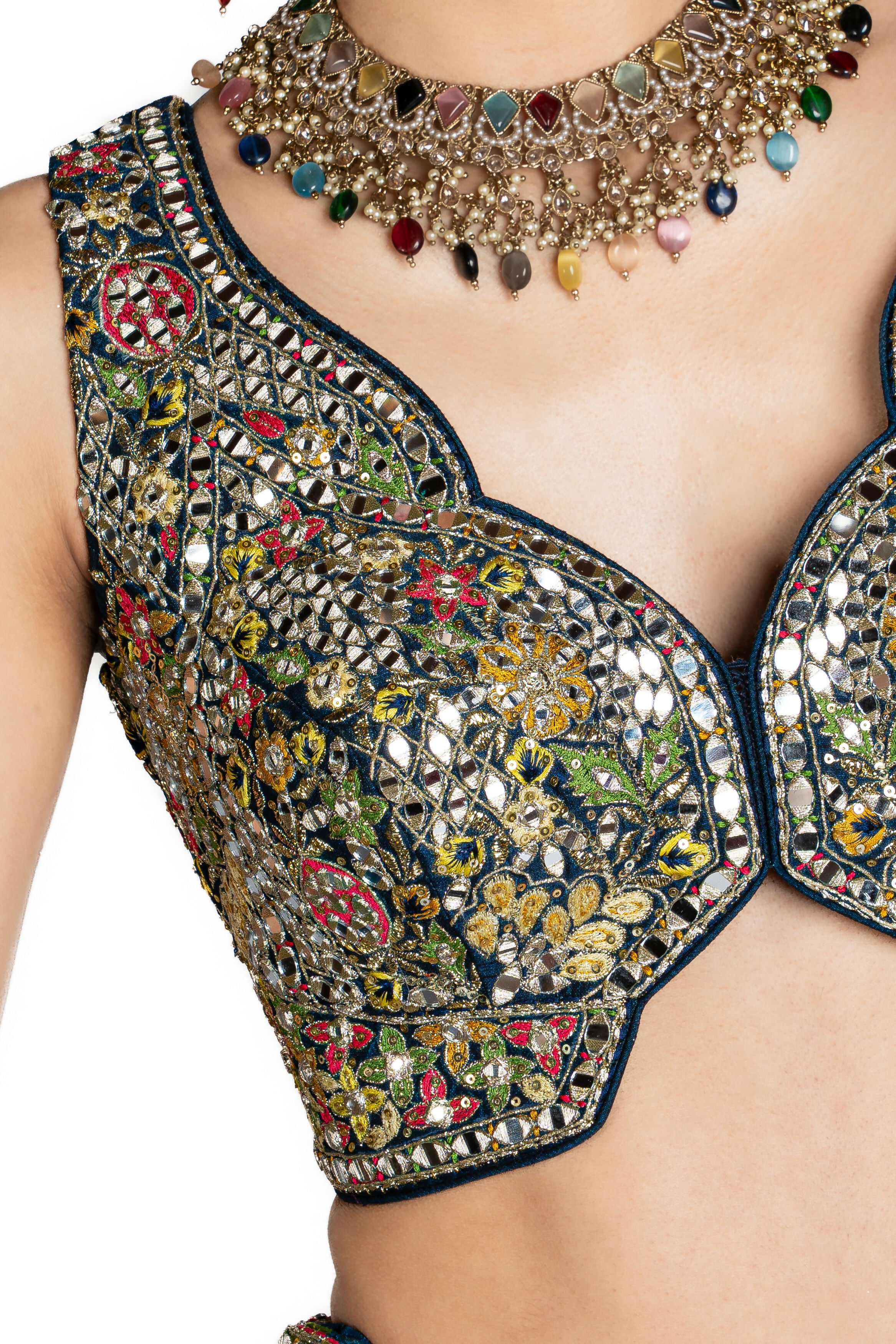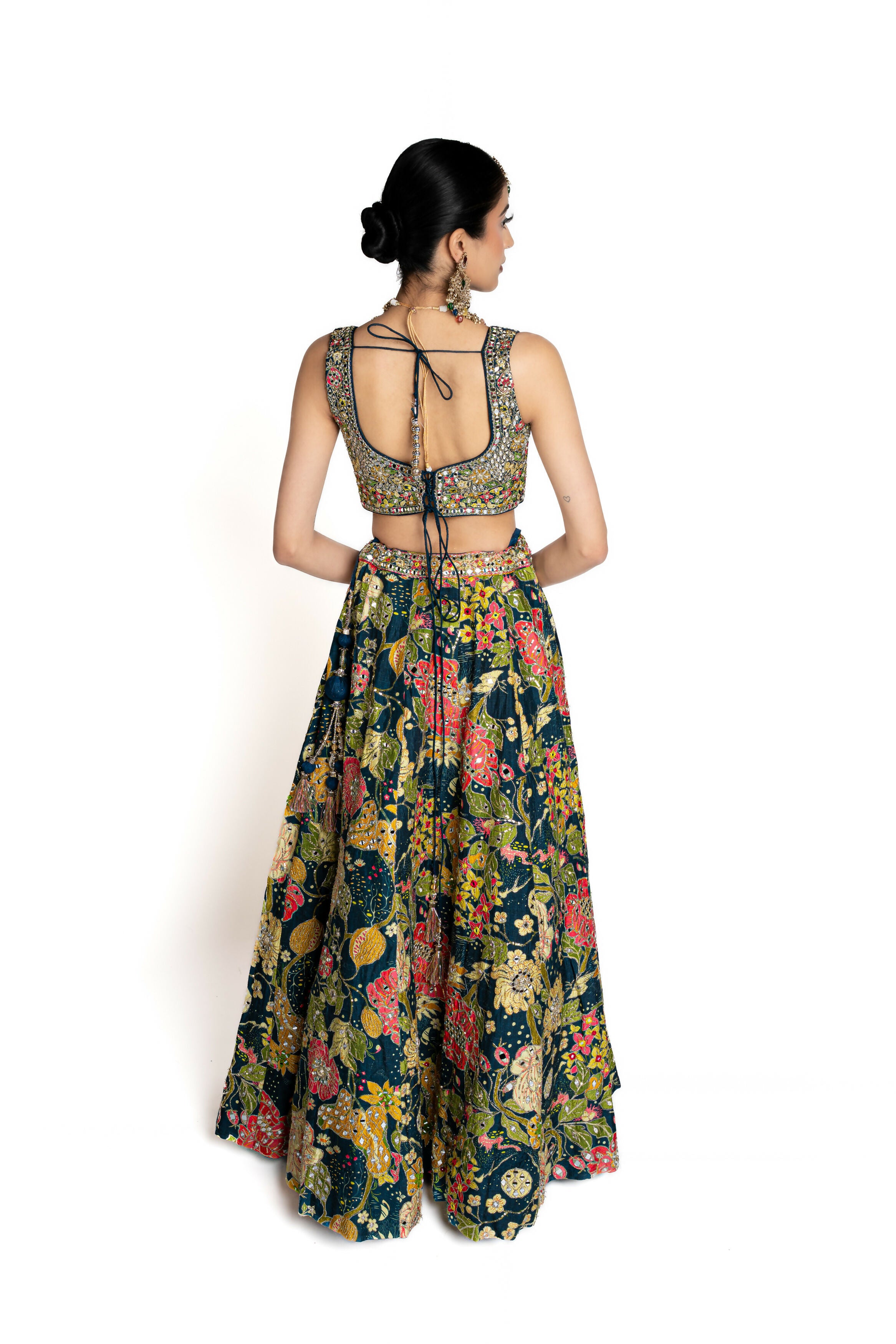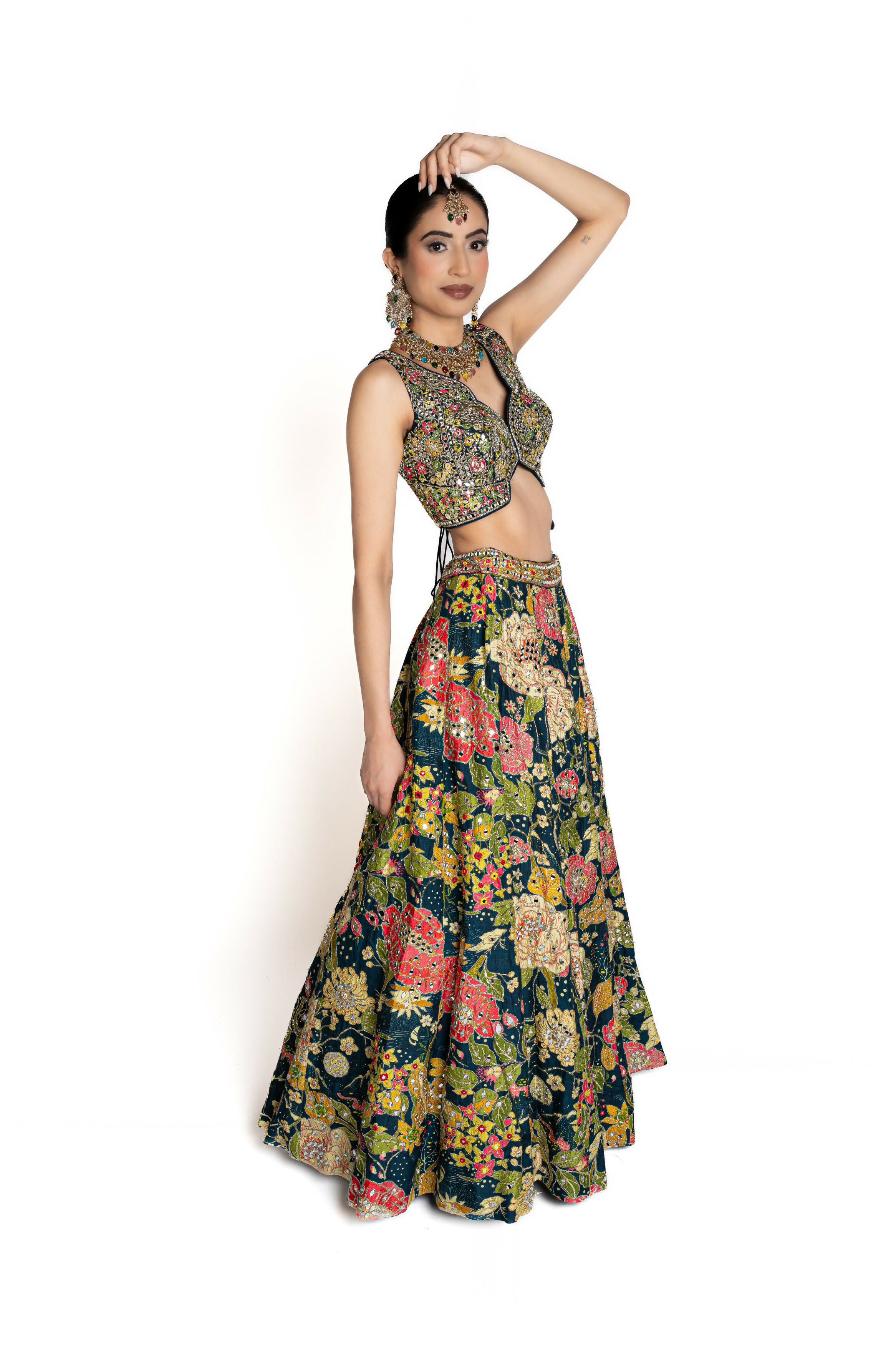 Chic, modern, and effortlessly elegant, Varnika is your go-to for any celebration that calls for standout style. Made from luxurious dupioni silk fabric in deep navy blue, this lengha is adorned with digitally printed florals and finished with delicate hand embroidery and mirror work for just the right touch of shimmer. It's bold yet graceful, making it perfect for upscale parties or evening functions.